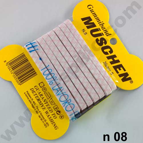 a matassa alto 4,5 mm per 5 metri, allungatura circa 290 % +/-10 %. Elastico bianco Treccia elastica, nastro, banda o fascia elastica, ottimo per l’intimo o per capi o accessori che richiedono nastri elastici piccoli con una ottima tensione ed estensione, che sopportino allungamenti continui e ripetuti, è molto resistente a lavaggi frequenti con detersivi e in acqua molto calda, lavabile lavaggio 95 gradi, questo tipo di elastico, o treccia elastica, è ottimo anche per i lavaggi a secco, quindi resistente a diluenti e benzine al percloroetilene, stirabile temperatura media, può andare in asciugatrice, è un nastro che se sottoposto a una tensione, tiraggio, alle sue estremità, si allunga, mantenendo però una tensione sulla sua lunghezza. ovvero tenderà a riportarsi alla lunghezza di partenza, con una certa forza. Se questa forza è notevole sarà un elastico medio, se è intensa sarà un elastico duro o rigido. Il Nastro elastico è composto da diversi fili di gomma, oppure di silicone, normalmente paralleli che formano l’ordito, sono il numero e lo spessore di questi fili che danno all’elastico la sua forza. Invece fili in poliestere, o in poliammide formano la trama. Con il tempo i lavaggi, lo stresso dovuto a sollecitazioni continue e sucessive, gli elastici tendono a perdere le loro caratteristiche elastiche e a slassare e quindi a non tornare alla lunghezza originale. Questa perdita di elasticità è dovuta alla purezza della gomma, quindi alla qualità dei materiali, allo spessore e al numero dei fili che compongono l’elastico, questo significa che a parità di qualità gli elastici della serie morbida tenderanno a perdere negli anni la loro elasticità di più di quelli medi e di quelli rigidi. Per avere un’idea della forza dell’elastico abbiamo inserito un parametro detto ALLUNGATURA, ovvero di quanto si allunga in percentuale un metro di elastico, se sottoposto alla forza (peso) di 1 kg, esempio con ALLUNGATURA del 200 % un elastico lungo 1 mt diventerà 2 mt. L’allungatura non è una costante assoluta nel tempo, dipende da vari fattori, purezza della gomma o del silicone età utilizzato per produrre il nastro elastico, sollecitazioni subite come lavaggi stirature tensioni continue subite durante la vita del prodotto oltre che dalla tensione applicata all’ elastico bianco treccia elastica.Composizione a norma di legge n 883 del 26nov1973, poliestere 60 %,fibra di gomma 40 %. Prezzo e vendita a MATASSA DA 5 mt.
