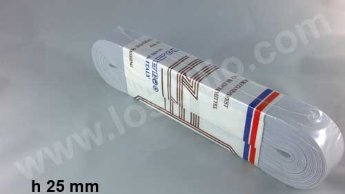 elastico medio bianco a matassa alto 25 mm per 10 metri, allungatura 165 %. elastico, nastro o banda o fascia elastica, lavabile lavaggio 95 gradi, stirabile temperatura media, può andare in asciugatrice, lavabile a secco con percloroetilene non trielina, è un nastro che se sottoposto a una tensione, tiraggio, alle sue estremità, si allunga, mantenendo però una tensione sulla sua lunghezza. ovvero tenderà a riportarsi alla lunghezza di partenza, con una certa forza. Se questa forza è notevole sarà un elastico medio, se è intensa sarà un elastico duro o rigido. Il Nastro elastico è composto da diversi fili di gomma, oppure di silicone, normalmente paralleli che formano l’ordito, sono il numero e lo spessore di questi fili che danno all’elastico la sua forza. Invece fili in poliestere, o in poliammide formano la trama. A volte per particolari esigenze, vi possono essere anche trame in cotone o altre tipologie di materiali. L’elastico in commercio si trova come nastro in diverse altezze, con diversa forza di ritorno, spessori, colori, finiture. L’elastico può essere piatto, tondo, rettangolare. Possiamo avere elastico opaco normale, opaco con un lato leggermente felpato per le spalline dei reggiseni, oppure con un lato rasato cioè lucido, oppure trovate elastico molto rigido per realizzare bustini particolari o per la tapezzeria, ovvero per poltrone divani e altri tipi di sedute questi tipi di elastico hanno un’allungatura limitata e tengono molto bene sulle cuciture. Con il tempo i lavaggi, lo stresso dovuto a sollecitazioni continue e sucessive, gli elastici tendono a perdere le loro caratteristiche elastiche e a slassare e quindi a non tornare alla lunghezza originale. Questa perdita di elasticità è dovuta alla purezza della gomma, quindi alla qualità dei materiali, allo spessore e al numero dei fili che compongono l’elastico, questo significa che a parità di qualità gli elastici della serie morbida tenderanno a perdere negli anni la loro elasticità di più di quelli medi e di quelli rigidi. Per avere un’idea della forza dell’elastico abbiamo inserito un parametro detto ALLUNGATURA, ovvero di quanto si allunga in percentuale un metro di elastico, se sottoposto alla forza (peso) di 1 kg, esempio con ALLUNGATURA del 200 % un elastico lungo 1 mt diventerà 2 mt. L’allungatura non è una costante e dipende da vari fattori oltre che dalla tensione applicata all’elastico.Composizione a norma di legge n 883 del 26nov1973, poliestere 84 %,fibra di gomma 16 %. Prezzo e vendita a MATASSA DA 10 mt.