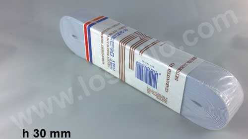a matassa alto 30 mm per 10 metri, allungatura 160 %. elastico, nastro o banda o fascia elastica, lavabile lavaggio 95 gradi, stirabile temperatura media, può andare in asciugatrice, lavabile a secco con percloroetilene non trielina, è un nastro che se sottoposto a una tensione, tiraggio, alle sue estremità, si allunga, mantenendo però una tensione sulla sua lunghezza. ovvero tenderà a riportarsi alla lunghezza di partenza, con una certa forza. Se questa forza è notevole sarà un elastico medio, se è intensa sarà un elastico duro o rigido. Il Nastro elastico medio bianco è composto da diversi fili di gomma, oppure di silicone, normalmente paralleli che formano l’ordito, sono il numero e lo spessore di questi fili che danno all’elastico la sua forza. Invece fili in poliestere, o in poliammide formano la trama. A volte per particolari esigenze, vi possono essere anche trame in cotone o altre tipologie di materiali. L’elastico in commercio si trova come nastro in diverse altezze, con diversa forza di ritorno, spessori, colori, finiture. L’elastico può essere piatto, tondo, rettangolare. Possiamo avere elastico opaco normale, opaco con un lato leggermente felpato per le spalline dei reggiseni, oppure con un lato rasato cioè lucido, oppure trovate elastico molto rigido per realizzare bustini particolari o per la tapezzeria, ovvero per poltrone divani e altri tipi di sedute questi tipi di elastico hanno un’allungatura limitata e tengono molto bene sulle cuciture. Con il tempo i lavaggi, lo stresso dovuto a sollecitazioni continue e sucessive, gli elastici tendono a perdere le loro caratteristiche elastiche e a slassare e quindi a non tornare alla lunghezza originale. Questa perdita di elasticità è dovuta alla purezza della gomma, quindi alla qualità dei materiali, allo spessore e al numero dei fili che compongono l’elastico medio bianco, questo significa che a parità di qualità gli elastici della serie morbida tenderanno a perdere negli anni la loro elasticità di più di quelli medi e di quelli rigidi. Per avere un’idea della forza dell’elastico medio bianco abbiamo inserito un parametro detto ALLUNGATURA, ovvero di quanto si allunga in percentuale un metro di elastico, se sottoposto alla forza (peso) di 1 kg, esempio con ALLUNGATURA del 200 % un elastico lungo 1 mt diventerà 2 mt. L’allungatura non è una costante e dipende da vari fattori oltre che dalla tensione applicata all’elastico.La composizione dell’elastico medio bianco è a norma di legge n 883 del 26nov1973, poliestere 84 %,fibra di gomma 16 %. Prezzo e vendita a MATASSA DA 10 mt.