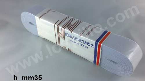 a matassa alto 35 mm per 10 metri, allungatura 150 %. elastico, nastro o banda o fascia elastica, lavabile lavaggio 95 gradi, stirabile temperatura media, può andare in asciugatrice, lavabile a secco con percloroetilene non trielina, è un nastro che se sottoposto a una tensione, tiraggio, alle sue estremità, si allunga, mantenendo però una tensione sulla sua lunghezza. ovvero tenderà a riportarsi alla lunghezza di partenza, con una certa forza. Se questa forza è notevole sarà un elastico medio, se è intensa sarà un elastico duro o rigido. Il Nastro elastico medio bianco è composto da diversi fili di gomma, oppure di silicone, normalmente paralleli che formano l’ordito, sono il numero e lo spessore di questi fili che danno all’elastico la sua forza. Invece fili in poliestere, o in poliammide formano la trama. A volte per particolari esigenze, vi possono essere anche trame in cotone o altre tipologie di materiali. L’elastico in commercio si trova come nastro in diverse altezze, con diversa forza di ritorno, spessori, colori, finiture. L’elastico può essere piatto, tondo, rettangolare. Possiamo avere elastico opaco normale, opaco con un lato leggermente felpato per le spalline dei reggiseni, oppure con un lato rasato cioè lucido, oppure trovate elastico molto rigido per realizzare bustini particolari o per la tapezzeria, ovvero per poltrone divani e altri tipi di sedute questi tipi di elastico hanno un’allungatura limitata e tengono molto bene sulle cuciture. Con il tempo i lavaggi, lo stresso dovuto a sollecitazioni continue e sucessive, gli elastici tendono a perdere le loro caratteristiche elastiche e a slassare e quindi a non tornare alla lunghezza originale. Questa perdita di elasticità è dovuta alla purezza della gomma, quindi alla qualità dei materiali, allo spessore e al numero dei fili che compongono l’elastico medio bianco, questo significa che a parità di qualità gli elastici della serie morbida tenderanno a perdere negli anni la loro elasticità di più di quelli medi e di quelli rigidi. Per avere un’idea della forza dell’elastico medio bianco abbiamo inserito un parametro detto ALLUNGATURA, ovvero di quanto si allunga in percentuale un metro di elastico, se sottoposto alla forza (peso) di 1 kg, esempio con ALLUNGATURA del 200 % un elastico lungo 1 mt diventerà 2 mt. L’allungatura non è una costante e dipende da vari fattori oltre che dalla tensione applicata all’elastico.La composizione dell’elastico medio bianco è a norma di legge n 883 del 26nov1973, poliestere 84 %,fibra di gomma 16 %. Prezzo e vendita a MATASSA DA 10 mt.