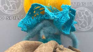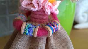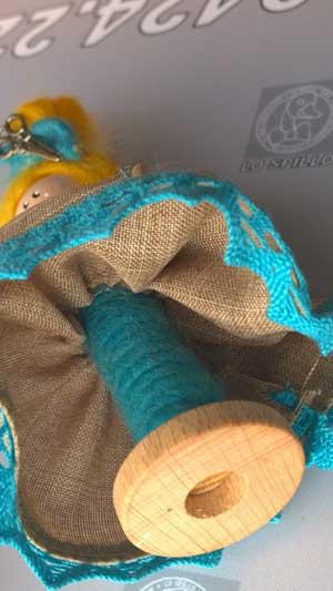 poi infilateli dentro a un pezzo lungo circa 17 cm del cordone cardato, portatandoli a metà del cordone, ora prendete le due estremità di questo cordone e incollatele sulla schiena delle, sartine con lana da infeltrire e sfera in legno, un po sotto l’attaccatura dei capelli.