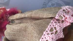 Infine per la gonna, cucite il pizzo su uno dei due bordi del nastro, arricciate l’altro bordo, mettete la gonna sui fianchi del paletto, saldate con la colla a caldo.